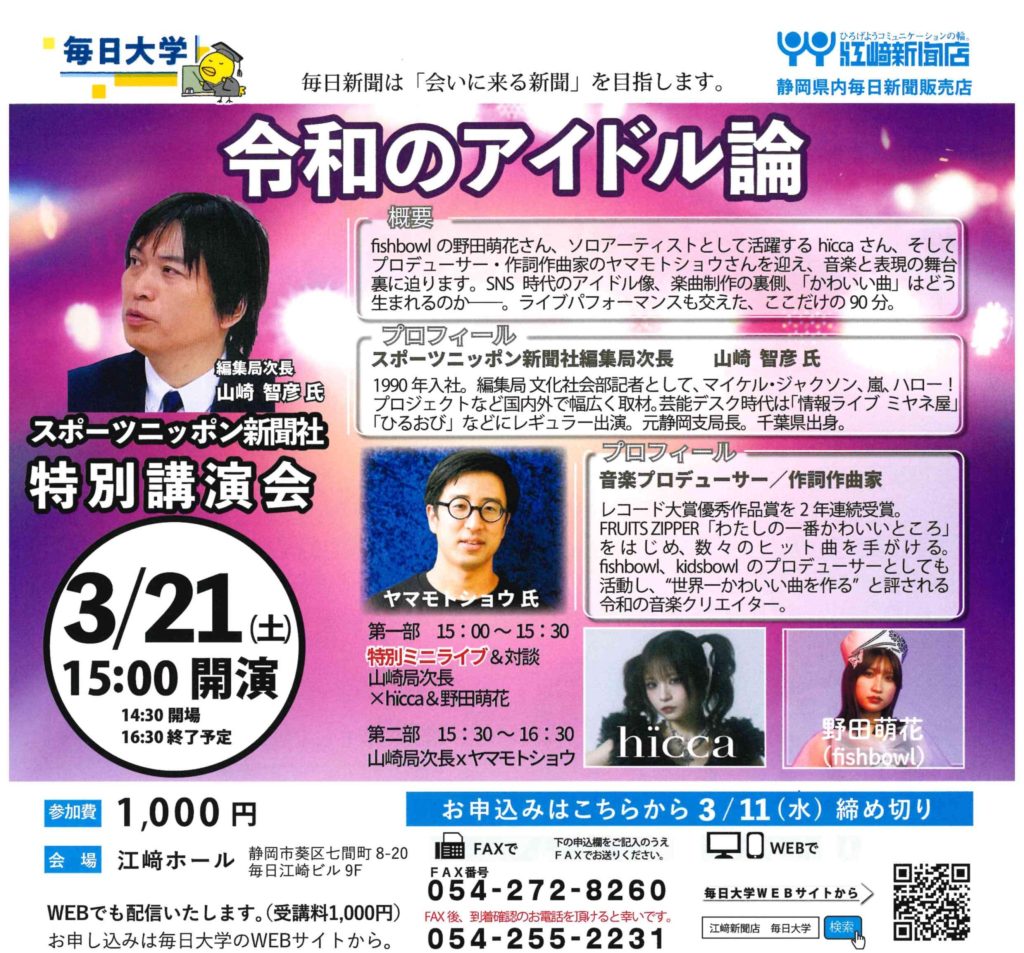【日 程】12月20日(土) 【時 間】14:30開場 15:00開演 【料 金】1,000円 【問合せ】江﨑新聞店 TEL054-255-2231 【申込み】申込みはこちら ※WEBでも配信いたします。(WEB配信はクレジット決済のみ)