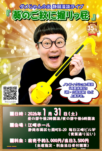 【日 程】1月31日(土) 【時 間】 昼の部14:00/夜の部18:00 【料 金】事前予約3,000円 当日3,500円 【問合せ】メール d-j-k@max.odn.ne.jp 【ホームページ】ホーム - d-j-k ページ! ※12月13日(土)午前10時よりチケット予約受付開始。 ご予約の際に、ご希望の公演時間/お名前/電話番号をお知らせください。 折り返し受付確認メールをお送りさせていただきます。 ※未就学児入場不可